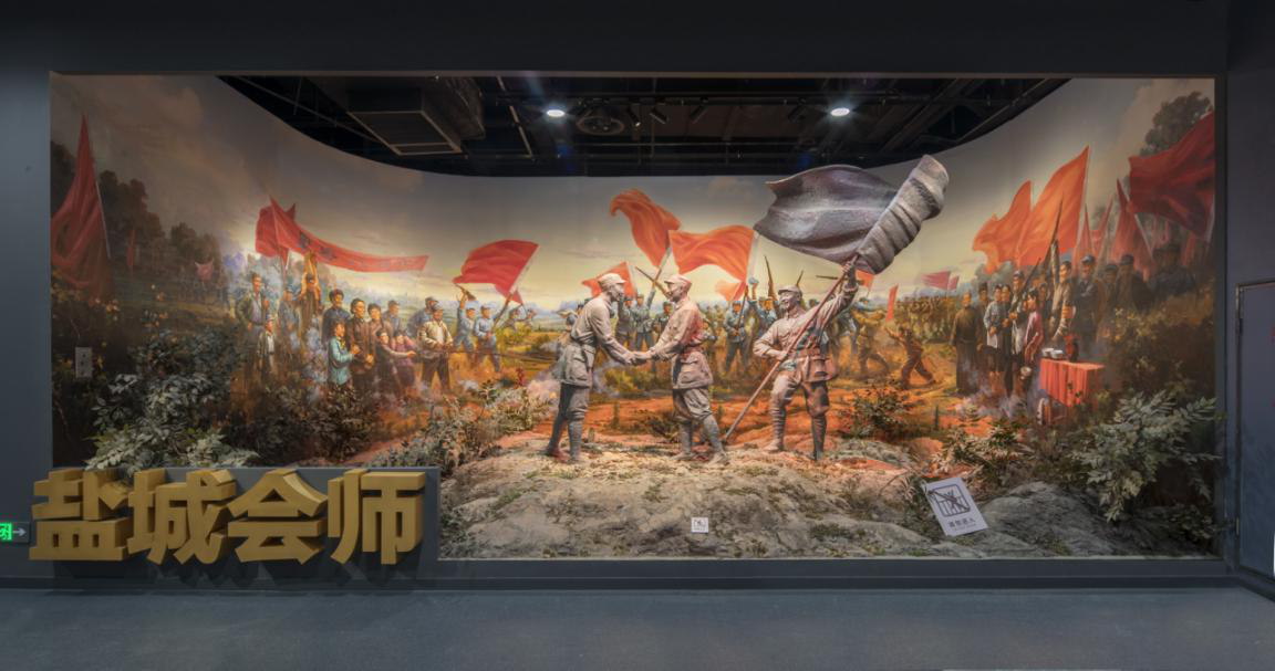 鹽城新四軍紀(jì)念館是全國(guó)唯一的專業(yè)性新四軍紀(jì)念館。醒目的藍(lán)白相間的“N4A”臂章圖案,鑲嵌在展廳正門上方,兩側(cè)旗形的花崗石陰雕畫,藝術(shù)地再現(xiàn)了新四軍與八路軍在白駒獅子口勝利會(huì)師和皖南事變后新四軍在鹽城重建軍部的歷史場(chǎng)面。